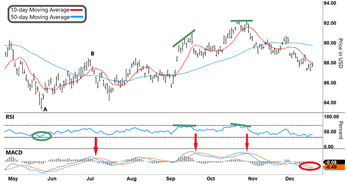 Now look at where TLT locks in a high at “B.” At that time, the RSI didn’t generate a clear signal. But the MACD line crossing back below the Signal line (left red arrow) showed a clear place to exit.
