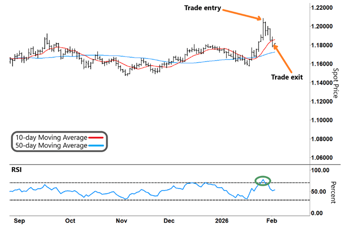 The RSI formed an inverse “V” (green circle) and retraced from overbought territory. That pushed EUR/USD lower and put our trade into profit.