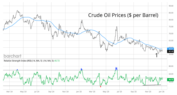 Oil prices found a recent bottom at “1” in mid-December. As I noted earlier, it’s time to pay attention when the price stops moving lower on bearish news.