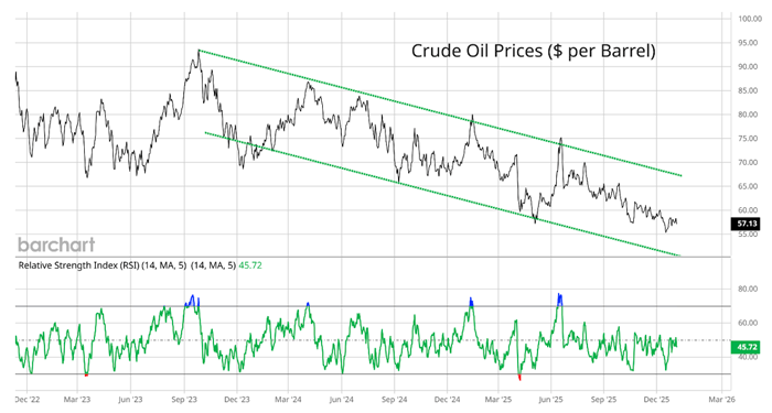 Oil prices have been stuck in an overall downtrend since late 2023, which you can see with the trend channel. While there have been plenty of whipsaws inside the channel, the price action has been mostly bearish for over two years.