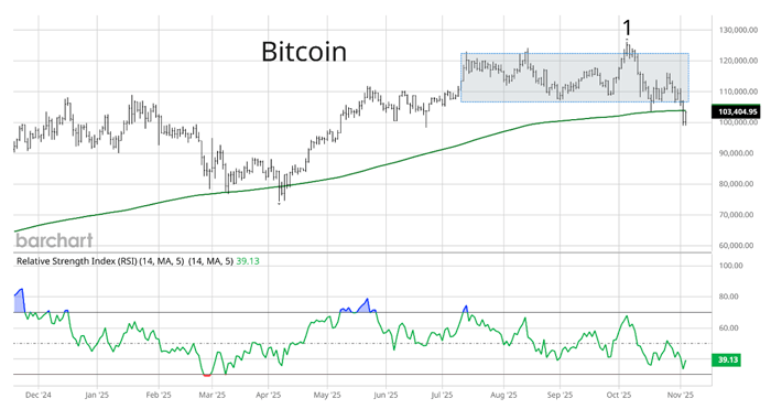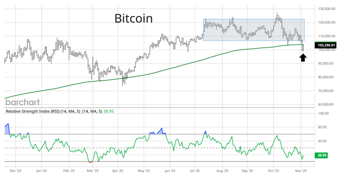A sustained break below $100,000 would point to downside momentum picking up for Bitcoin. That would be a negative sign for just about any “risk-on” asset, including stock prices…