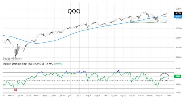 You should also watch the Relative Strength Index (RSI) in the bottom panel. When a primary trend changes from an uptrend to a downtrend, the RSI will often become overbought at the 60 level. QQQ is currently at that level.
