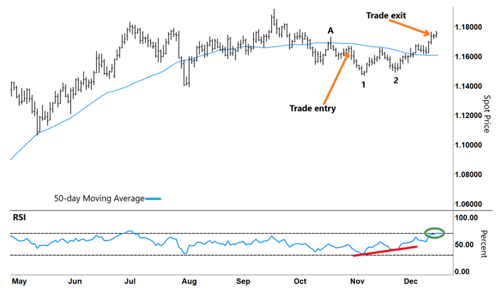 With the RSI heading into overbought territory (green circle), we decided to take our profits off the table. We exited the trade with a 115 pip gain. That equates to $1,150 for anyone trading a standard lot position size.