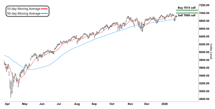 If we just sold the call option by itself, we could be setting ourselves up for big losses if SPX broke through the 7000 level and kept rallying. That’s where the second leg of the spread trade fits into the picture. In effect, the higher strike price on the bought call protects us like a stop loss.