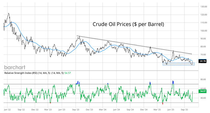 Oil prices fell back toward the $57 per barrel level, creating a bullish double-bottom chart pattern (shaded box).