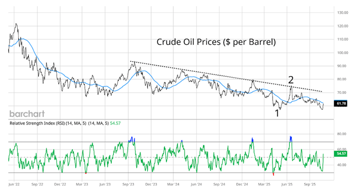 Oil prices fell as low as $57 per barrel in May at “1,” and then they rallied to test the downtrend line again at “2.”