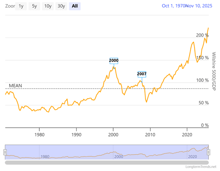 At 223%, the indicator is being pushed to the highest level ever seen. That’s more stretched than just before 2008’s Financial Crisis and 2022’s bear market.