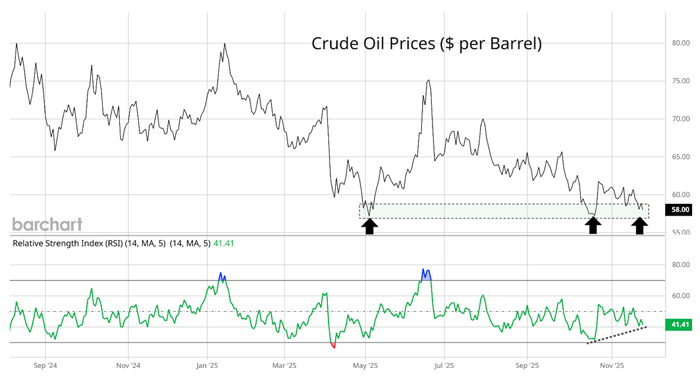 This most recent test could also show a positive divergence on the Relative Strength Index (RSI). The RSI is making a higher low as oil falls back toward the $57 level. That shows downside momentum is fading on the most recent move lower.