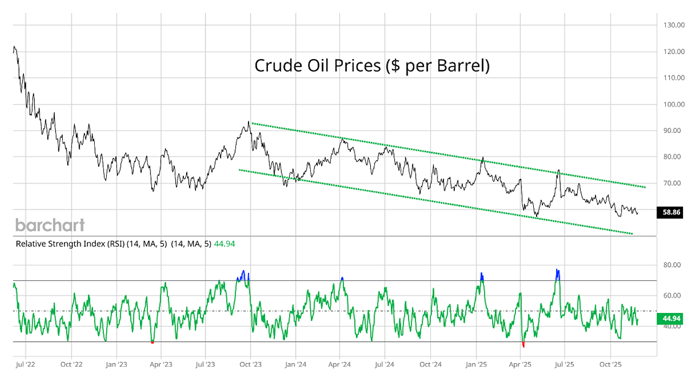 Since late 2023, oil prices have been stuck in a downtrend, with a series of lower highs and lower lows (trend channel).