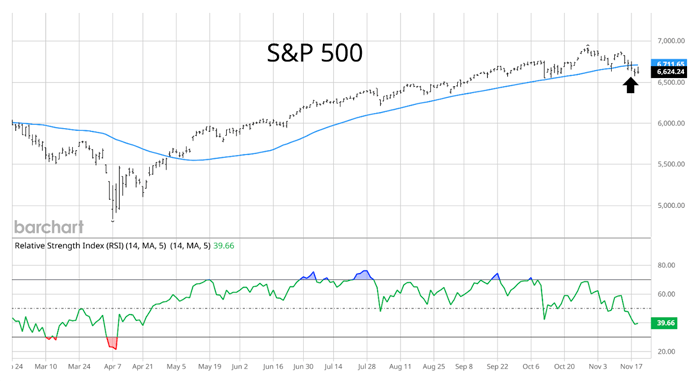 We’ve also noted the sharp deterioration in stock market breadth, which is how you measure participation in a trend. (Fewer stocks in the trend = a weakening trend.) While the S&P 500 was making new highs near the end of October, less than half of the stocks in the index were trading above their own 50-day MA.