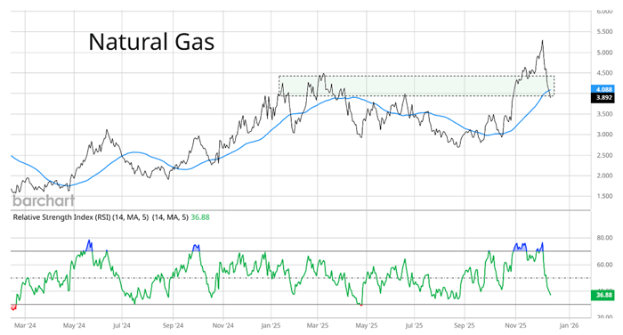 Natural gas is testing support at the 50-day moving average (blue line). At the same time, price support in the $3.90 to $4.50 zone is coming into play (shaded area in the dashed box).