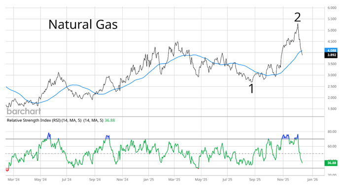 Natural gas gained as much as 97% from this year’s low at “1” to the highs at “2” in early December.