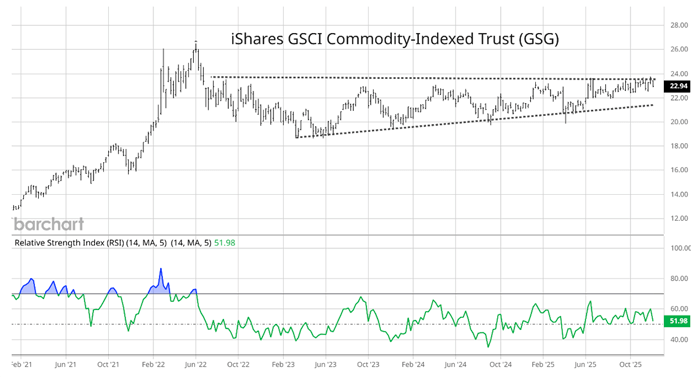Since the peak in 2022, GSG has pulled back as CPI disinflation took hold and fell toward the Fed’s 2% target.