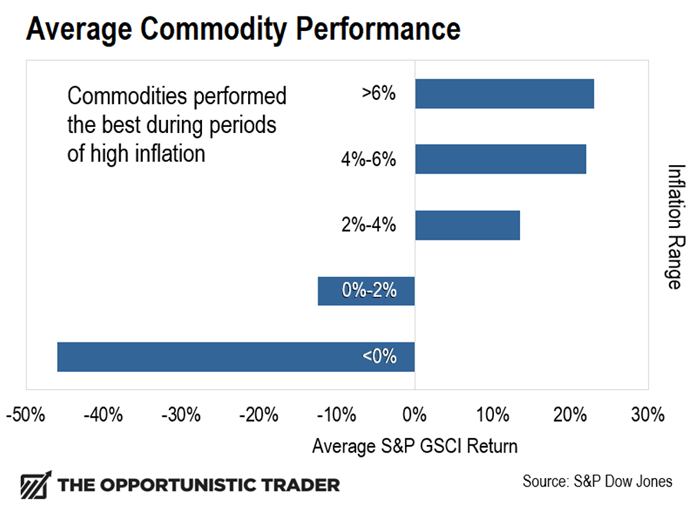 When inflation stays above the Fed’s 2% target, commodities have historically delivered an average annual return in the double digits.