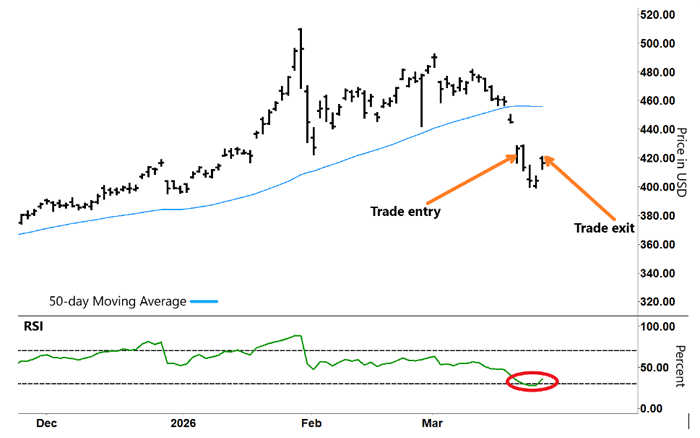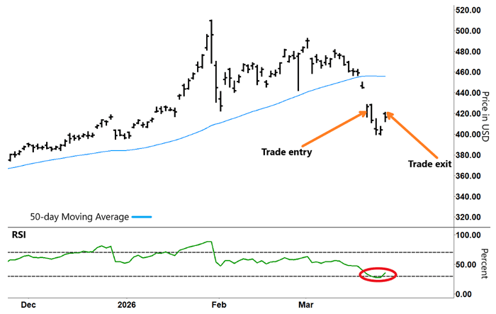 As the RSI rebounded out of oversold territory (red circle), the anticipated up move began. But GLD had only traded back to around the same level as when we entered the trade.