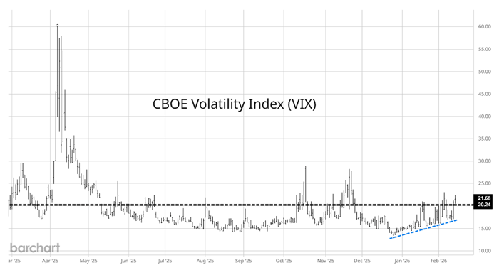 The VIX has done something interesting since the end of 2025. It closed at 13.5 on Christmas Eve. Since then, the VIX has been making a steady series of higher lows. Here’s the chart: