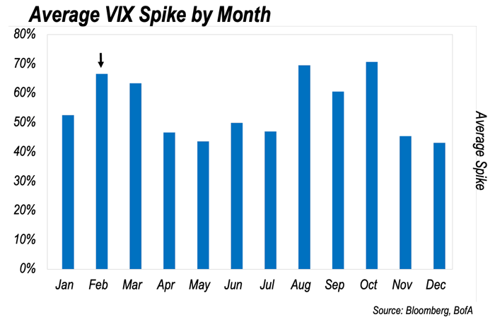 When investor panic sets in, the VIX can move in a hurry. And historically, February averages the third-largest VIX spike compared to all other months (see the arrow). March’s spike history doesn’t slip by much.
