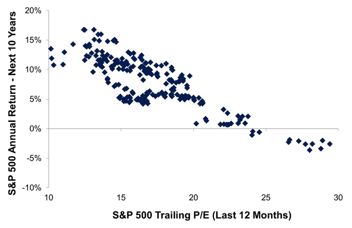 The chart plots the S&P 500’s price-to-earnings (P/E) ratio on the horizontal axis and the subsequent 10-year return on the vertical axis.